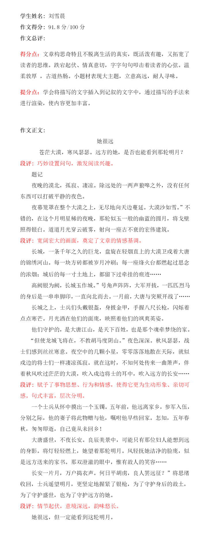 “位卑未敢忘忧国。”家国情怀是永远不过时的。翻开二十四史,纵览古今兴衰,多少风流人物谱写了一首首不朽的史诗。在史诗的字里行间,是一个个平凡的身影。一个卫戍边疆的士兵,在千年的历史长河中不过是一粒微尘,但当他拿起尖闪寒芒的长枪时,便是一个保家卫国的英雄,便是一段传奇!“她很远”,“她”不仅指人,也指阔别已久的故乡。将戍边将士的思乡,大漠的孤寂和盛世的繁华相互穿插,更能表现出戍边将士“舍小家,为大家”的爱国之情。我想以这篇文章,来告诉人们,不要忘记,有许许多多默默无闻的人,在远离家和亲人的地方,守护着身后的盛世,守护着我们的幸福。