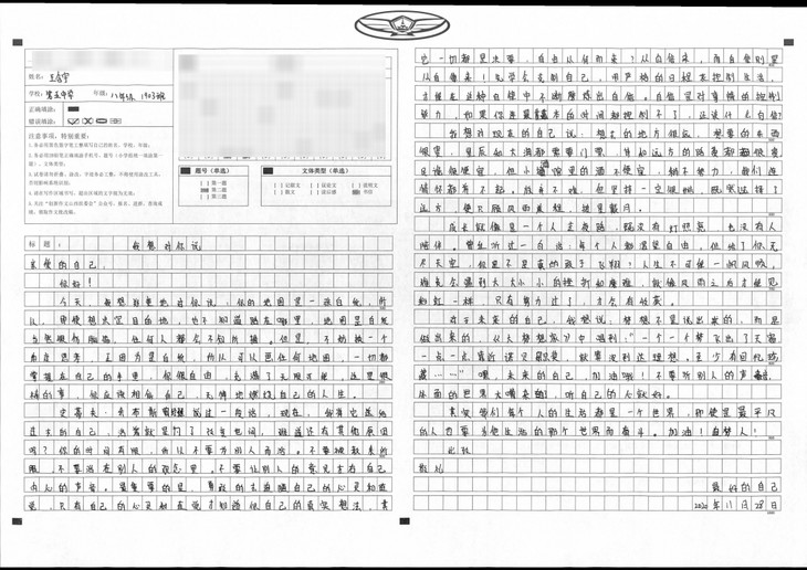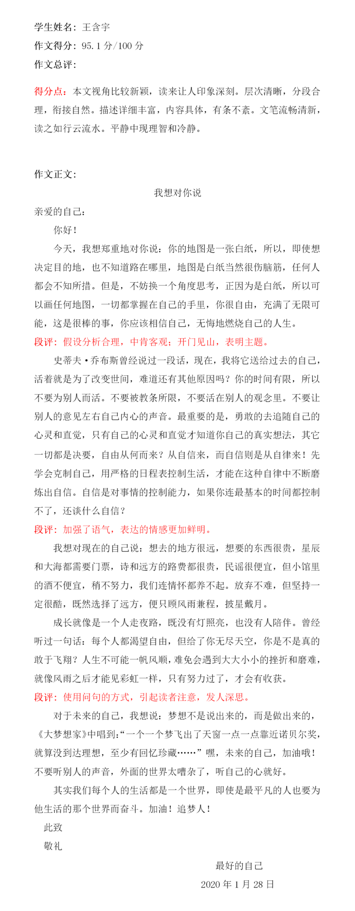 2、立足自我个性鲜明———作者巧妙地选取与过去、现在、未来的“我”作自我对白,言之有序,结构严谨。全文洋溢着小作者的清纯、亮丽、真实和自信,读后让人倍感鼓舞。