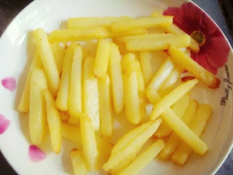 2、把土豆条放到锅里煎成金黄色,盛出来放在旁边;