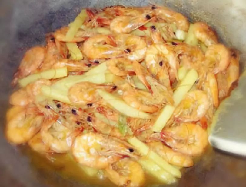 3、放干辣椒,蒜末煸炒,待蒜炒到金黄色,放虾和土豆条,放1捏盐,1捏白糖,半勺料酒,半勺美极翻炒;