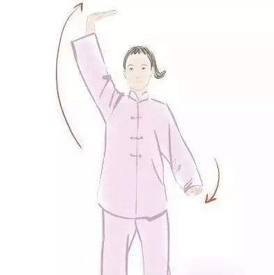 别看这个动作简单,想做到位还需体会内劲儿,即手臂上举时缓缓吸气,小腹微收,单臂上举至头顶时,力达掌根,感受撑天拄地的劲力,使身体对拉拔长;手臂下落时慢慢呼气,小腹微松,尽可能地呼尽体内浊气。