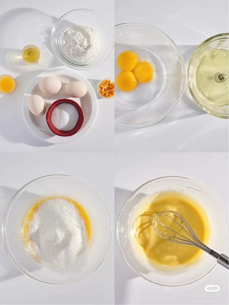 4.蛋黄中加入玉米油和橙汁,切拌均匀