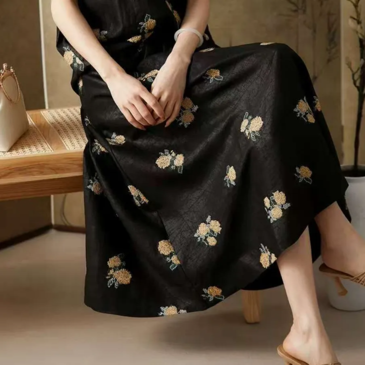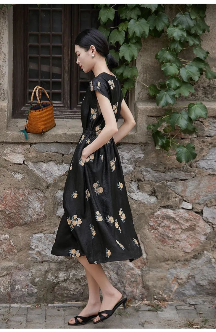 尤为特别的是,这款连衣裙采用龟裂纹香云纱面料,手感爽滑不粘腻,夏日穿真的是太舒服了!