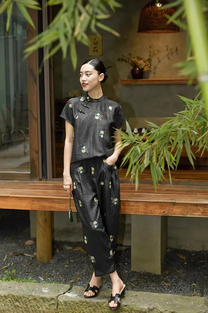 旗袍款立领斜肩香云衫和香云裤,一盘一扣都写满对生活的松弛感。