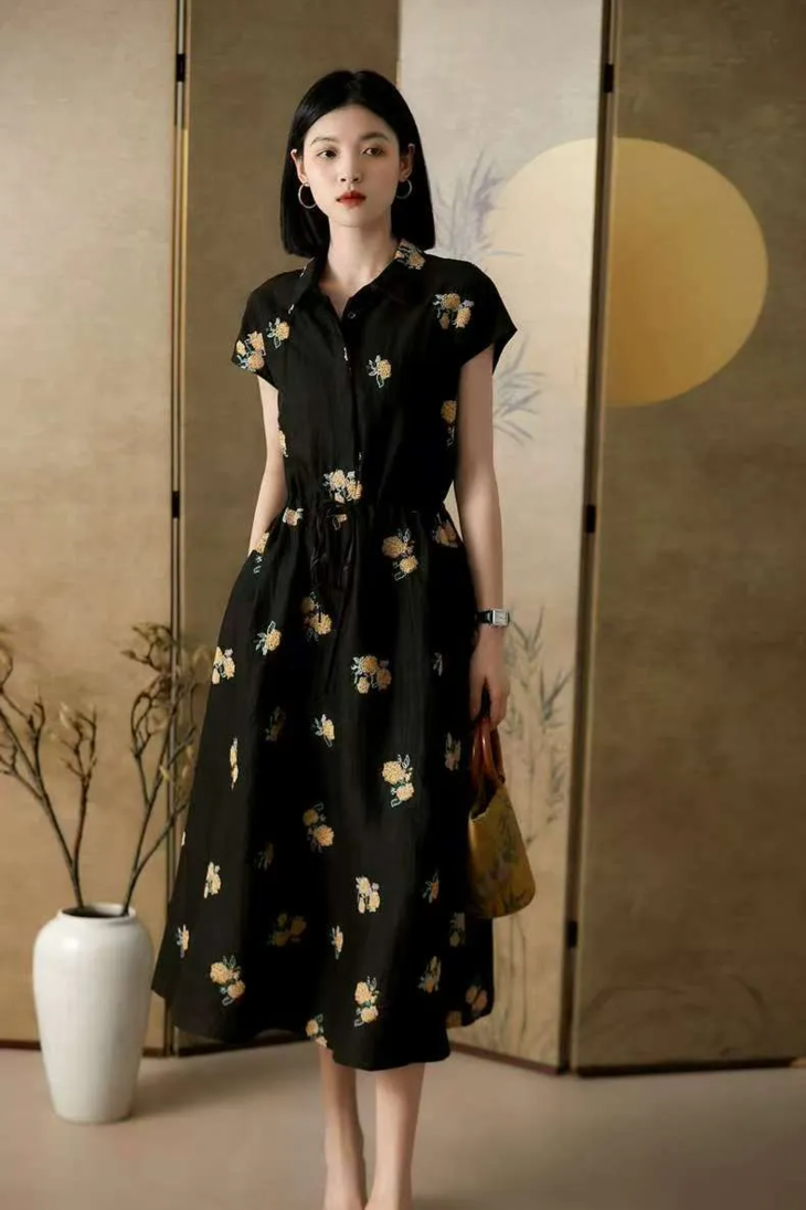 A字裙摆,腰间收碎褶,容量更大,对身材包容性好,行走间带动裙身绣花,灵动飘逸,优雅女人味尽显。