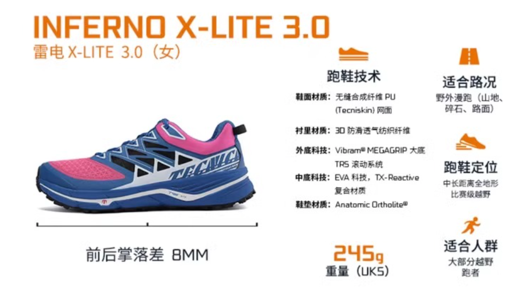 3、TECNICA泰尼卡 雷电inferno xlite3缓震越野跑鞋:1590元,618特价仅需699元