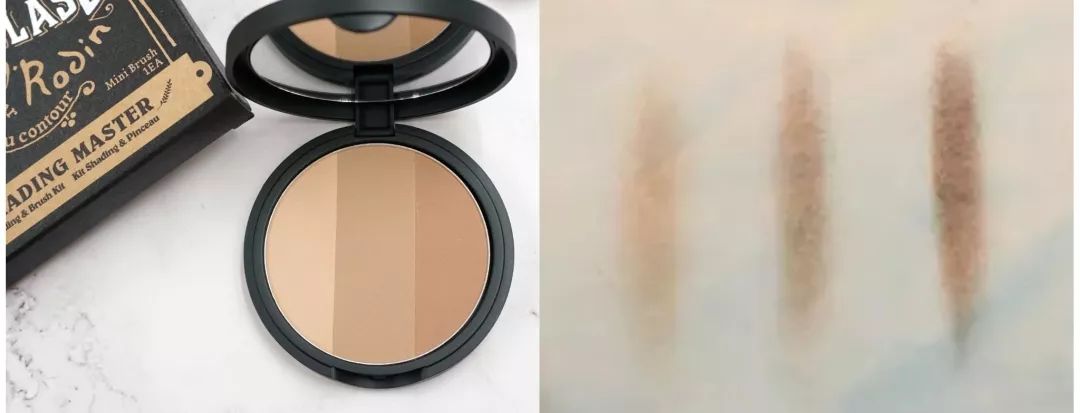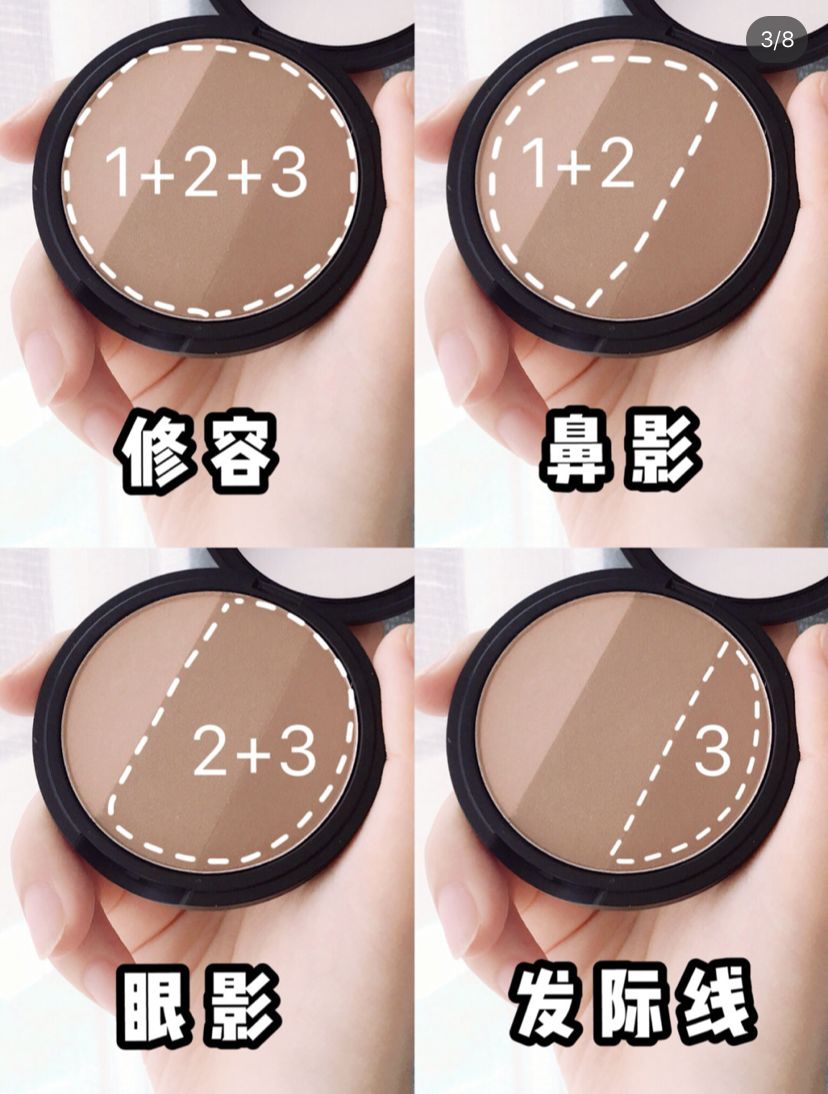 最左边(最浅)的颜色最能伪装了!对于日常妆或光线充足的地方,妆容会很明显,甚至有些突兀,用最浅色来打鼻影,看起来像修容于无形,暖裸色立刻缩小鼻子,又看不出来涂了修容,感觉像是天生的立体鼻子,很适合白皮日常妆!黄皮可以调和三色使用~还能修饰卧蚕哦~