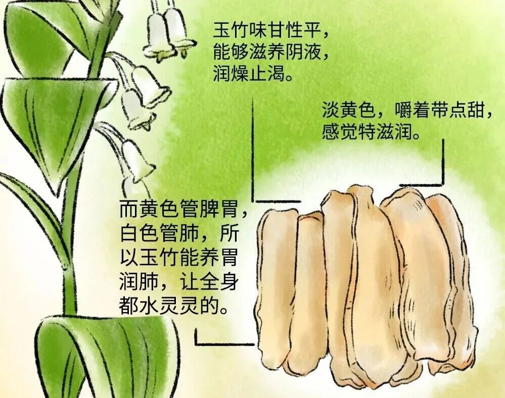 《本草便读》记载玉竹:“而养阴之药,又易碍邪,唯玉竹甘平滋润,虽补而不碍邪。”[3]玉竹长相温润,性味温和,功效也很“君子”,能补阴,还“不敛邪”、清爽不滋腻,孩子也适合。
