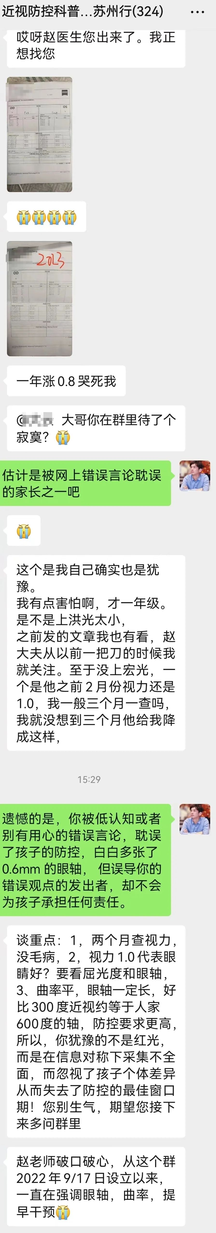 这个近视防控群是2022年建立的,群里的家长关注我都很早,对4L疗法其实很早就了解了。发生这样的事,我很遗憾,更多的是心痛。因为错误的认知,白白耽误了孩子的近视防控,发现孩子眼轴真的暴涨了,才想起来重视和后悔,太可惜了。