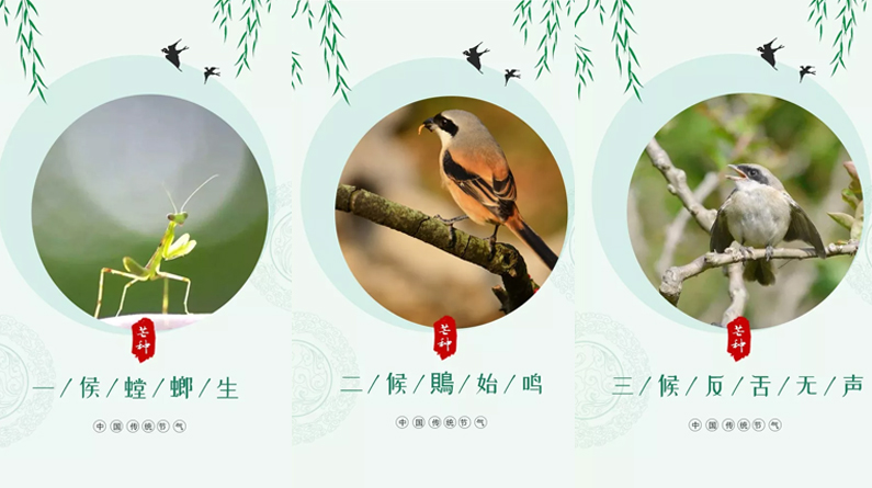 芒种节气大自然阳气达到一个高峰,阴气也随着而来。故而在芒种三侯中,有得阴气而生的螳螂,还有因为阴气而无声雀鸟(反舌无声)。