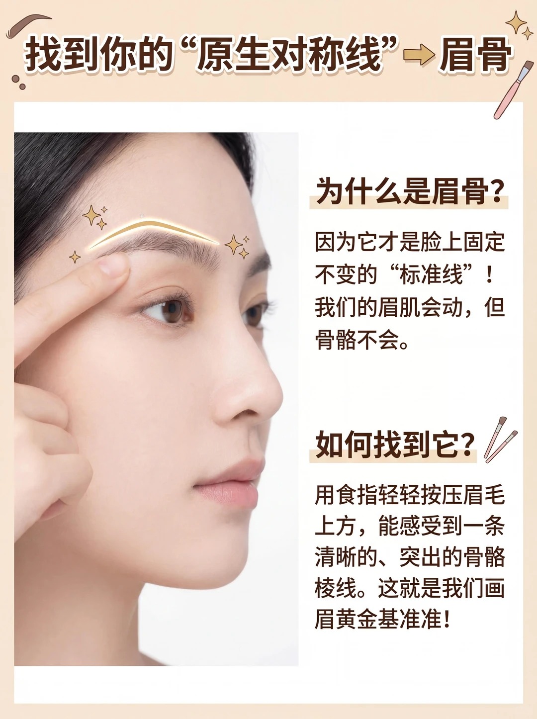 闭上眼睛,用手指轻轻按压眉毛区域,能清晰摸到一条突出的骨骼边缘,这就是你的眉骨啦!它就是我们画眉的基准线。