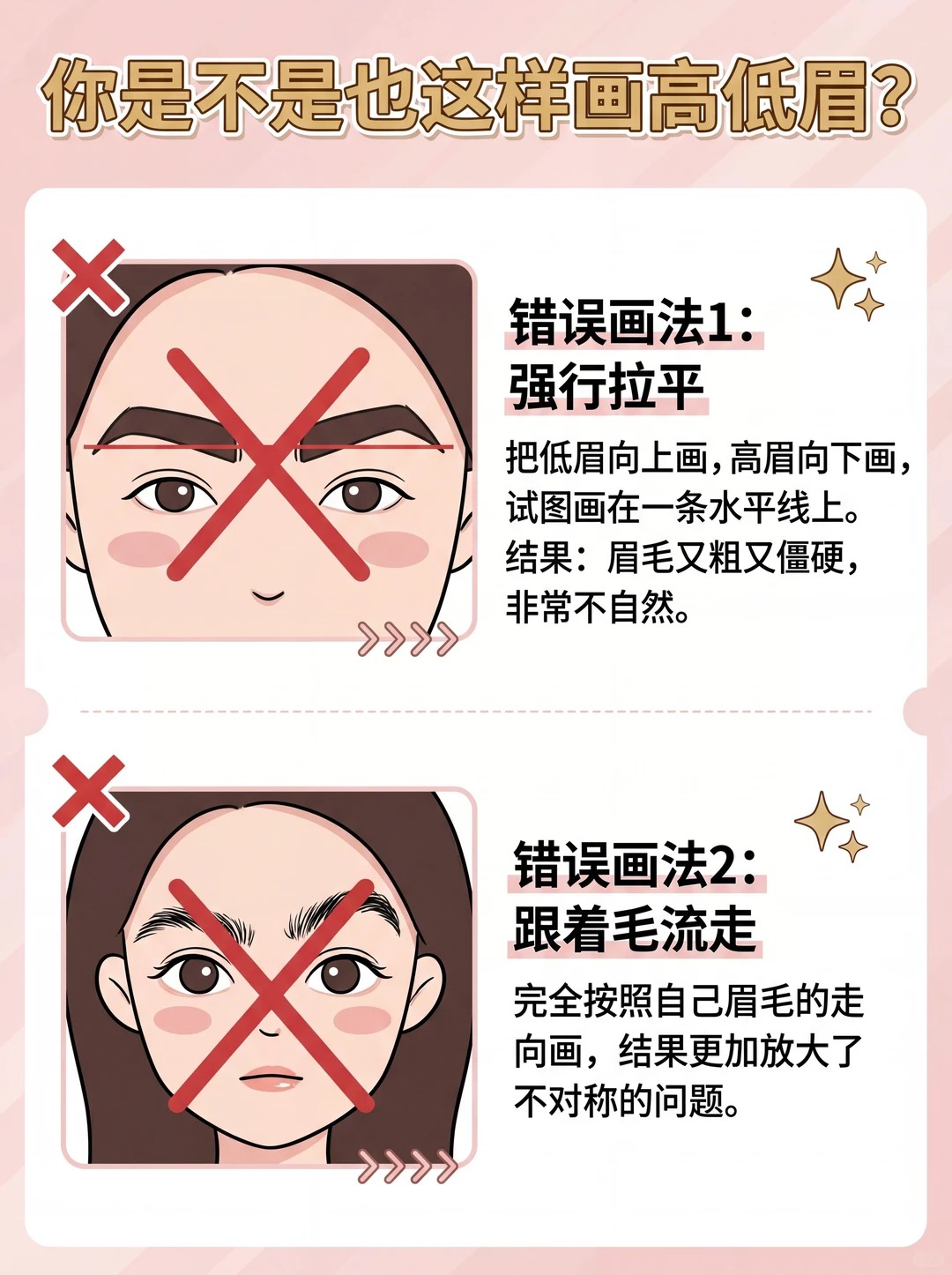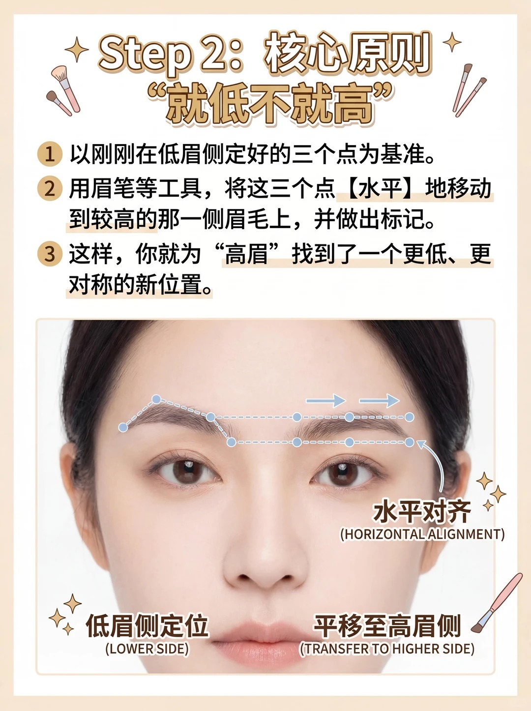 2️⃣ “就低不就高”,确定眉形框架这是最最关键的一步!我们要以【位置较低】的那一侧眉毛为标准。