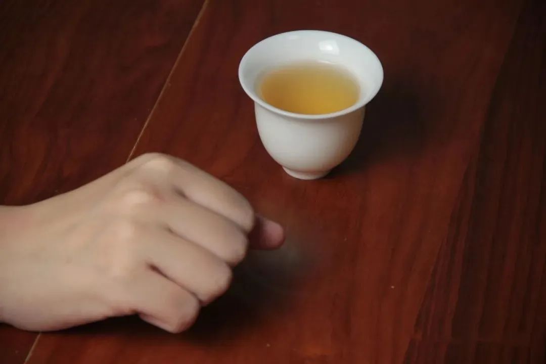 长辈倒茶:五指并拢半握成圈,拳心向下,五个手指同时叩击桌面,轻敲三下即可。