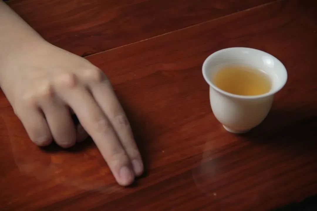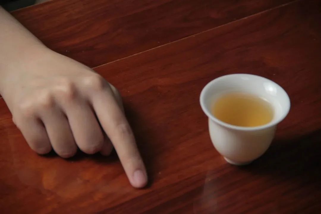 平辈倒茶:食指和中指并拢微曲,轻叩桌面三下。