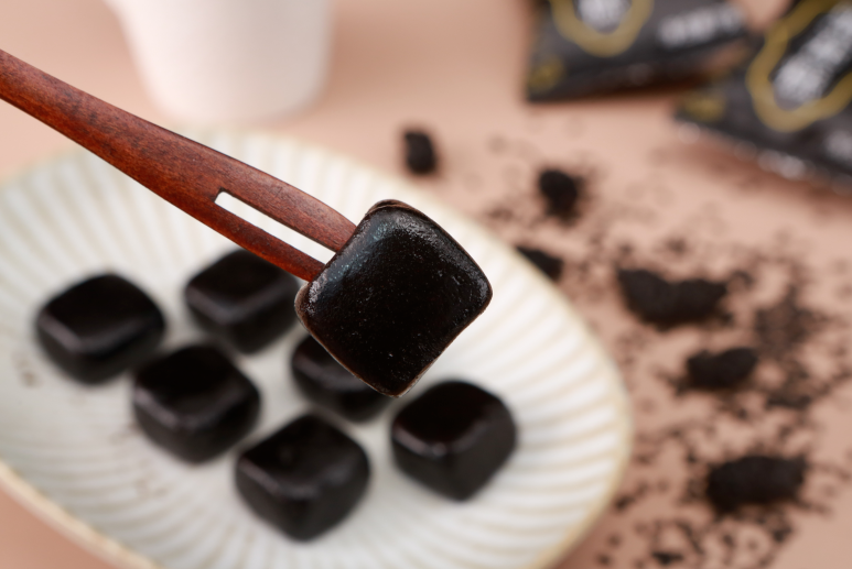 黑葚糕闻起来很香,口感酸甜带点类似龟苓膏的中药清香,后味是九蒸九晒黑芝麻的淡淡香味,回味甘甜。