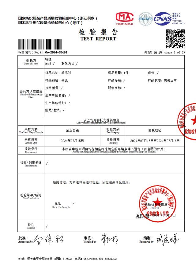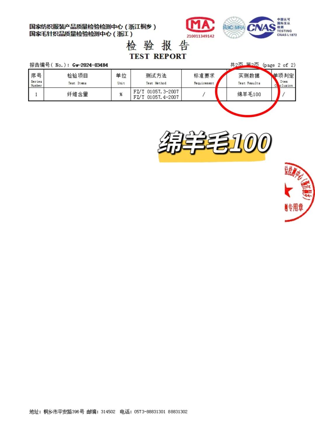 还有权威第三方机构检测报告:100%纯羊毛!防伪可查!