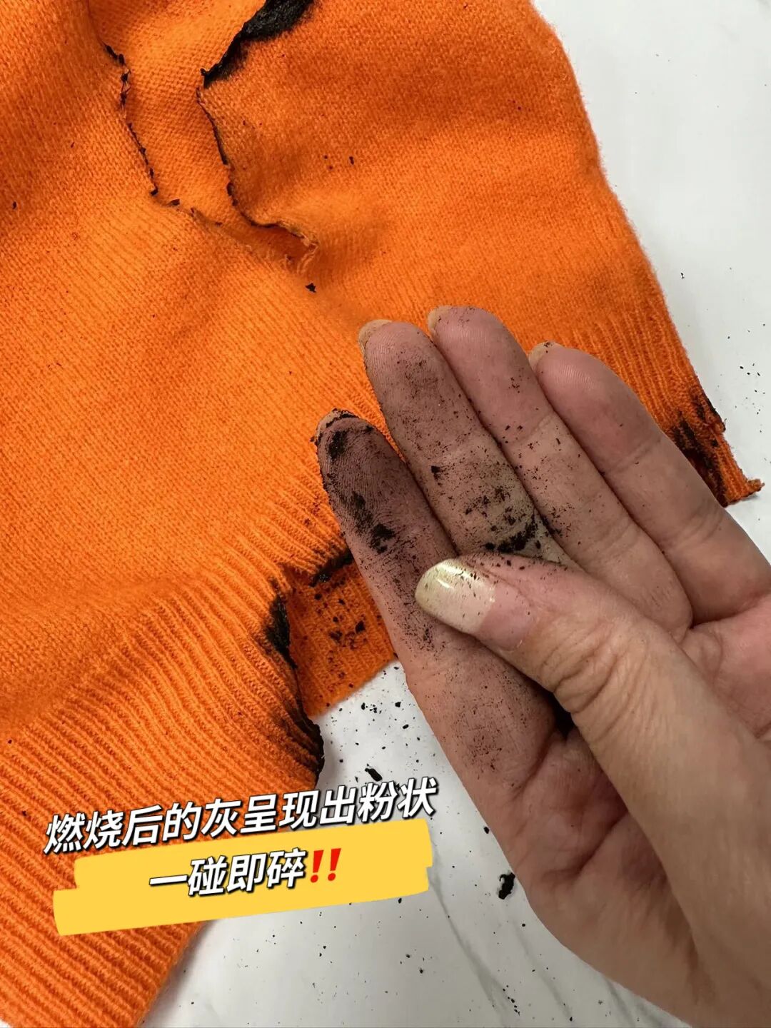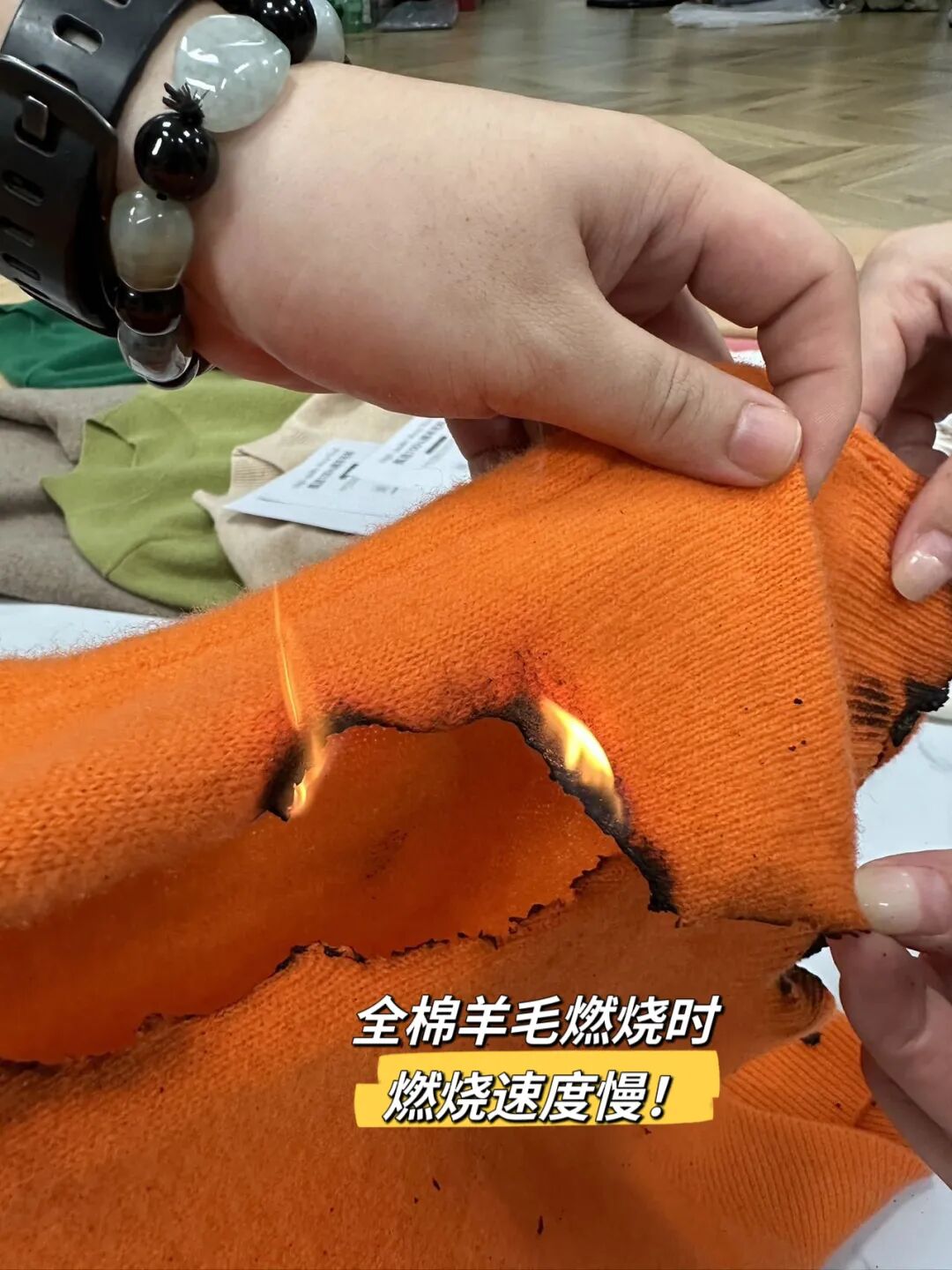 点着燃烧有烧焦羽毛的味道,灰烬用手指一压即碎(化纤的会结块压不碎),真羊毛无疑!