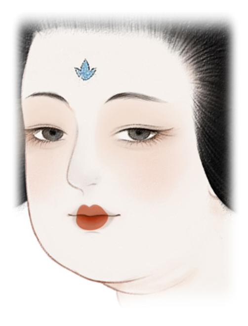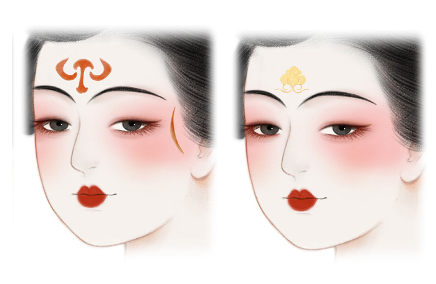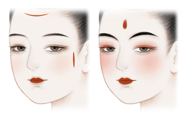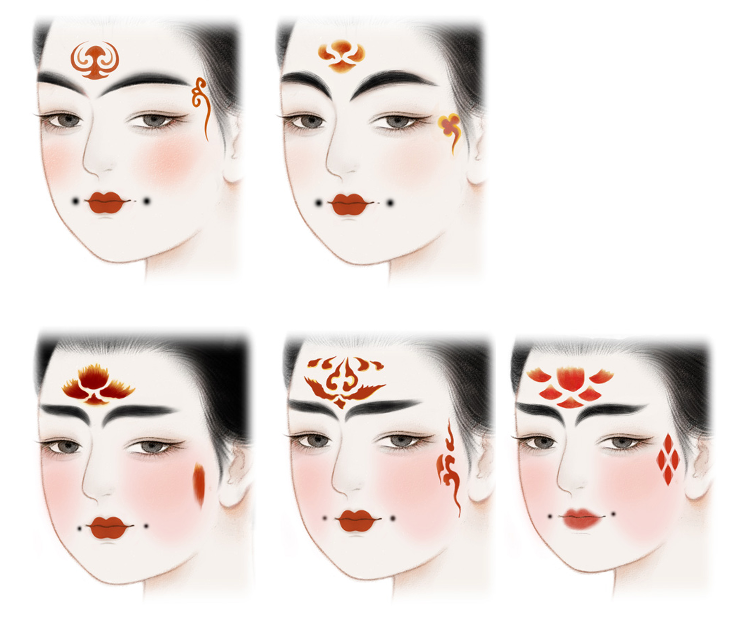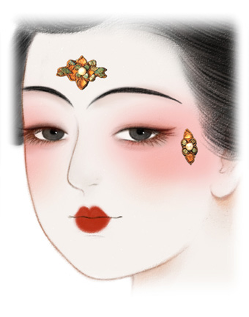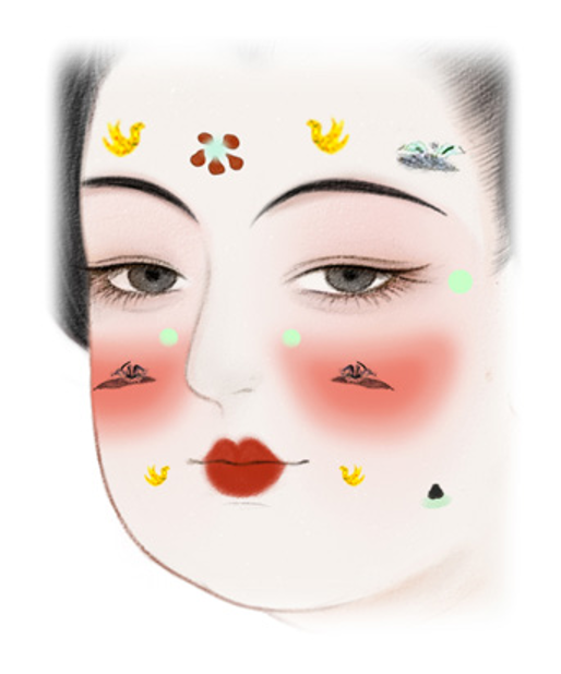 花钿式样更为丰富,有些甚至用华丽的金银珠玉制作;面靥可贴在嘴角及眼下承泪等处;斜红除常规形态外更有作五色飞鸟状的。