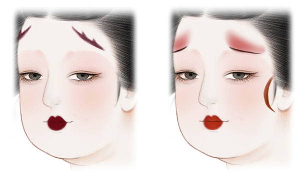 剃去眉毛,在眼睛上下画出三四道红紫色长痕,如瘀血一般。