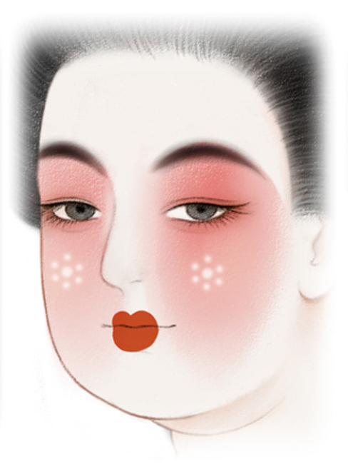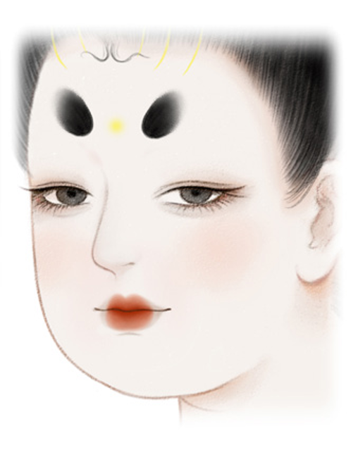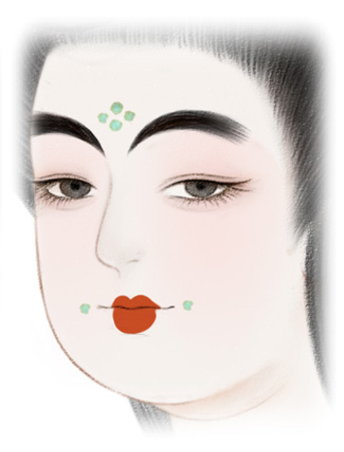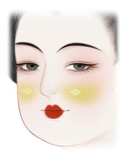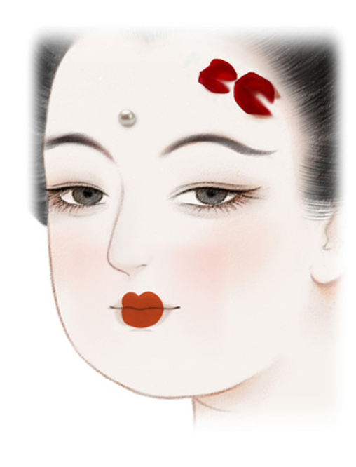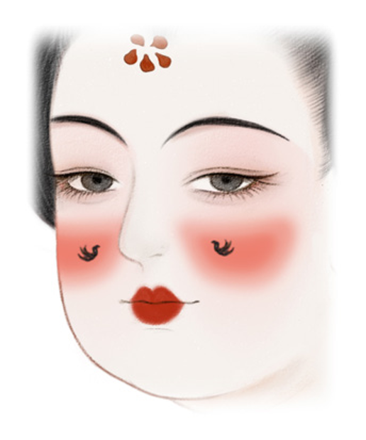 传说中天宝年间后宫嫔妃喜爱的妆容,在脸颊以素粉点上花样。