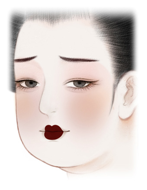 双眉画作悲愁似啼的八字状;斜红与面妆融合,只表现为脸畔红粉的浅浅边际线,如被眼泪染出痕迹一般。