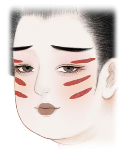 在贞元式妆容的基础上进一步夸张化,不用胭脂粉妆而是仿效游牧民族的“赭面”习俗,再画出八字愁眉与乌色嘴唇。