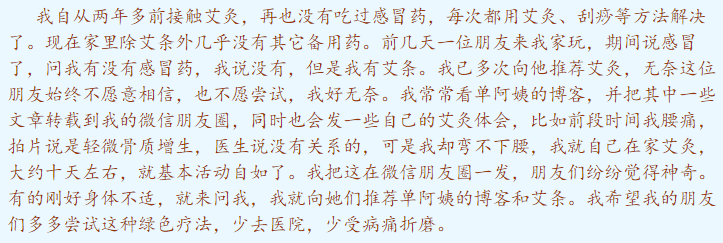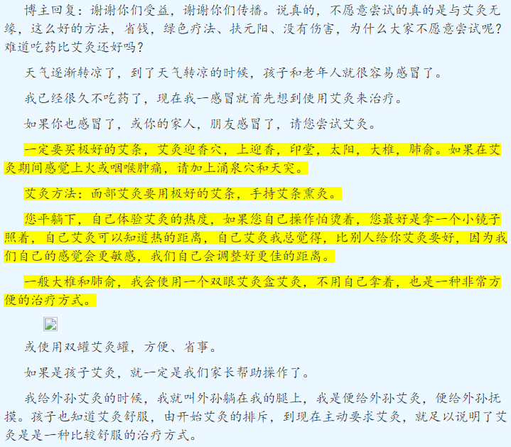 我已经很久不吃药了,现在我一感冒就首先想到使用艾灸来调理。