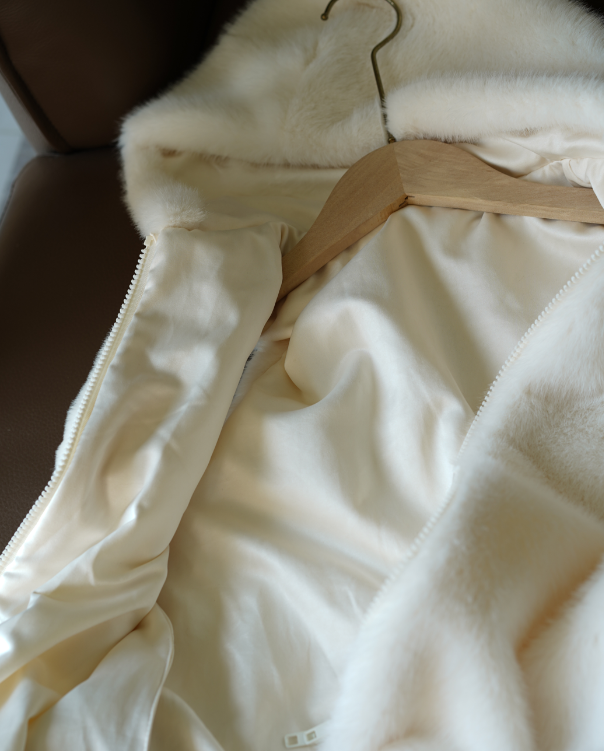 内里是拥有真丝手感的混纺缎面材质,光泽有肌理,这是只有万元皮草才会配的真丝质感面料。