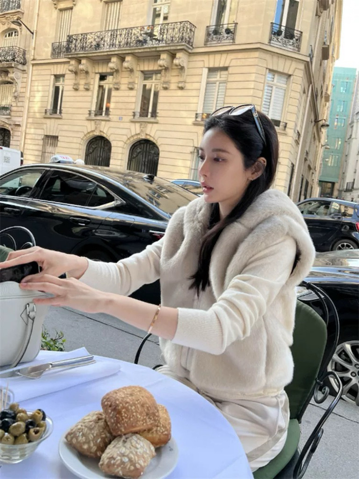米白色显得干净、气质又衬肤色,做了连帽设计的马甲,穿起来不会显成熟,反而更减龄。