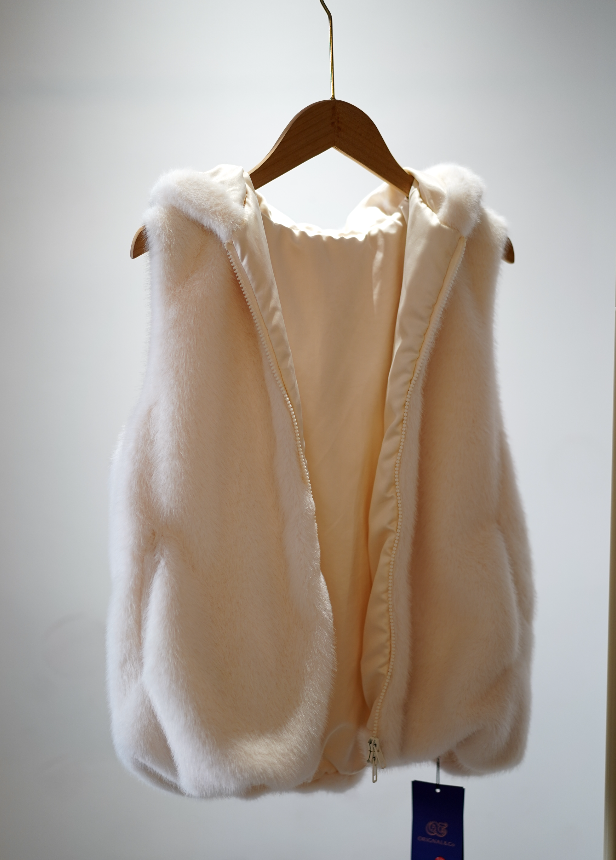 这是一款非常减龄的欧貂马甲外套,版型为微微散开的小A字形,特别好搭配。