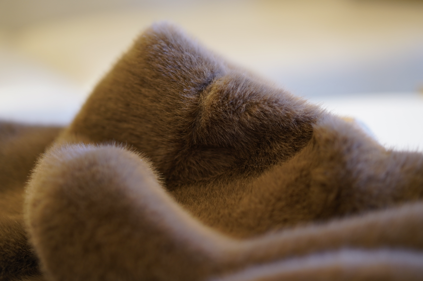 它是由貉子毛、兔毛、羊毛以及其他不同种类纤维混合纺织而成,手感和光泽媲美真貂绒。