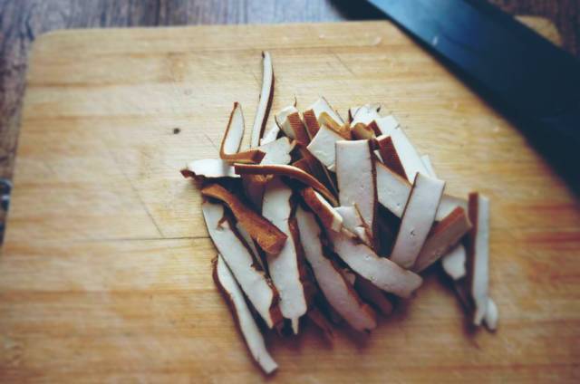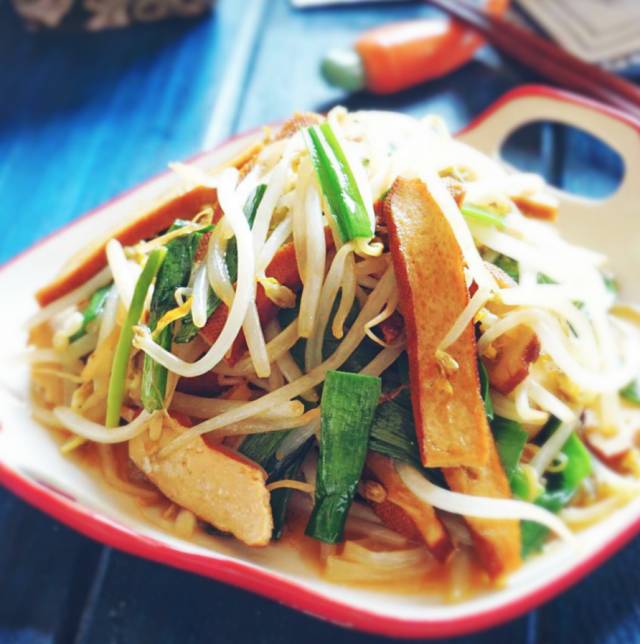 韭菜3两,豆芽菜6两,豆腐干2块;