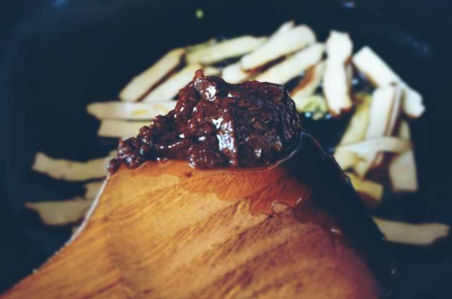 2、豆腐干下锅,翻炒几下,加入1勺黄豆酱;