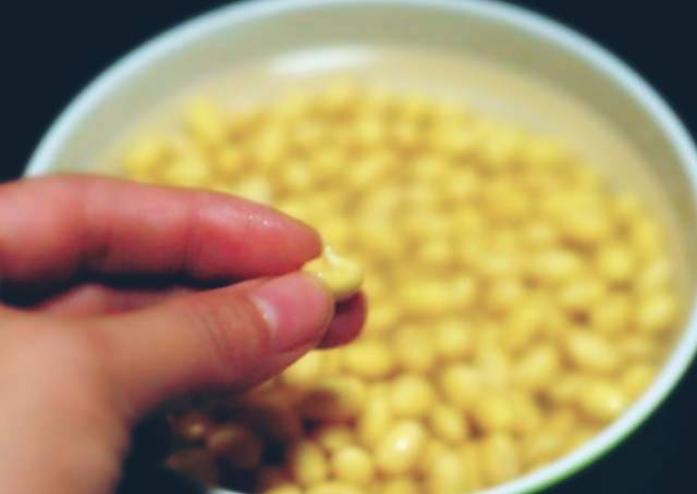 第一步,先把黄豆放入温热水中,泡6个小时;