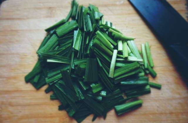 3、韭菜最后放,大火翻炒,时间不超过一分钟,韭菜不容易出汤。