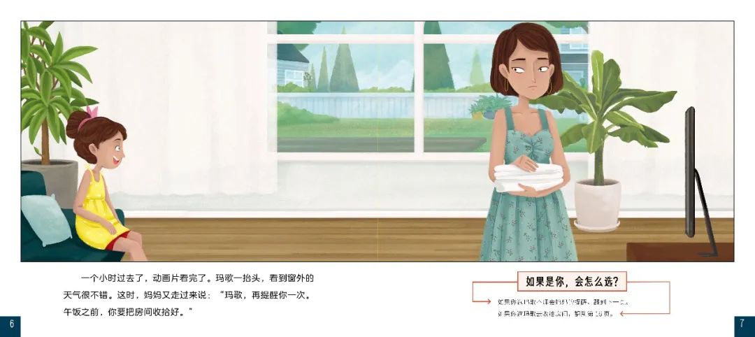 周六是和妈妈约定好的“整理”日。这时候,玛歌是去打扫房间,还是再玩一会呢?