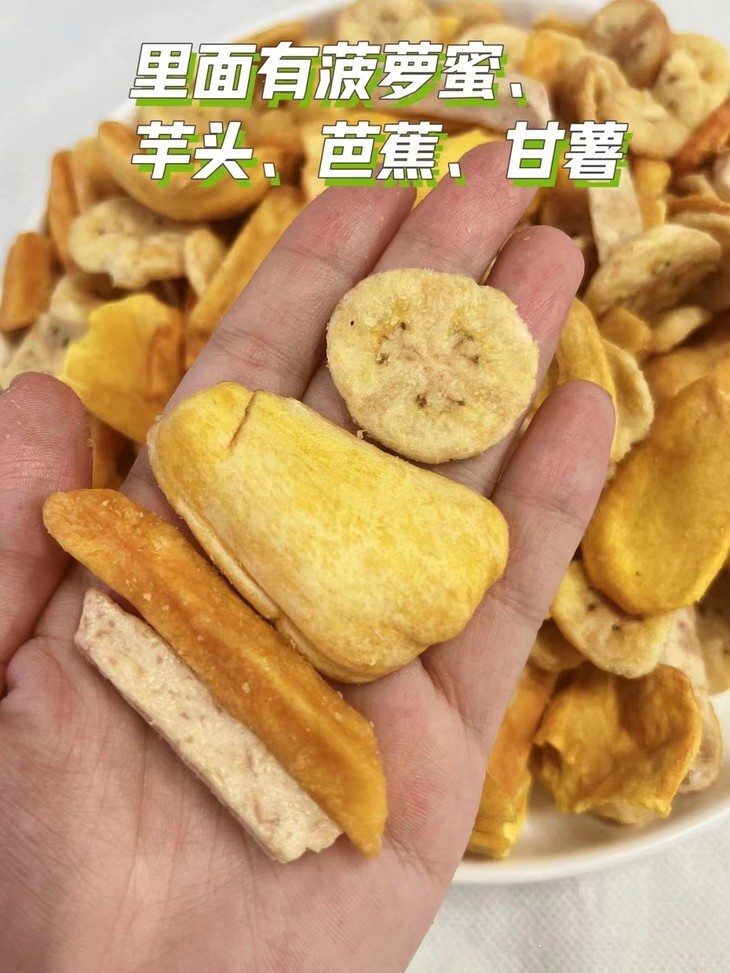 里面含有菠萝蜜、芋头、芭蕉、甘薯,配料很干净,口感鲜香酥脆,当零食吃健康又好吃,小朋友和孕妇都可以解解馋哦~