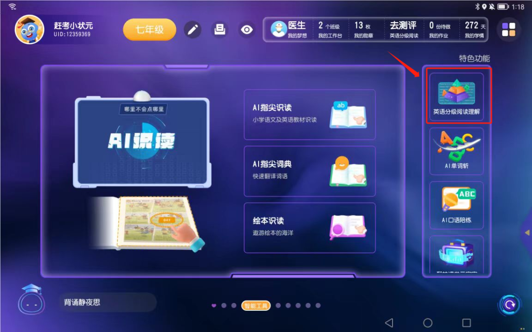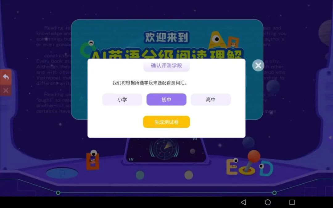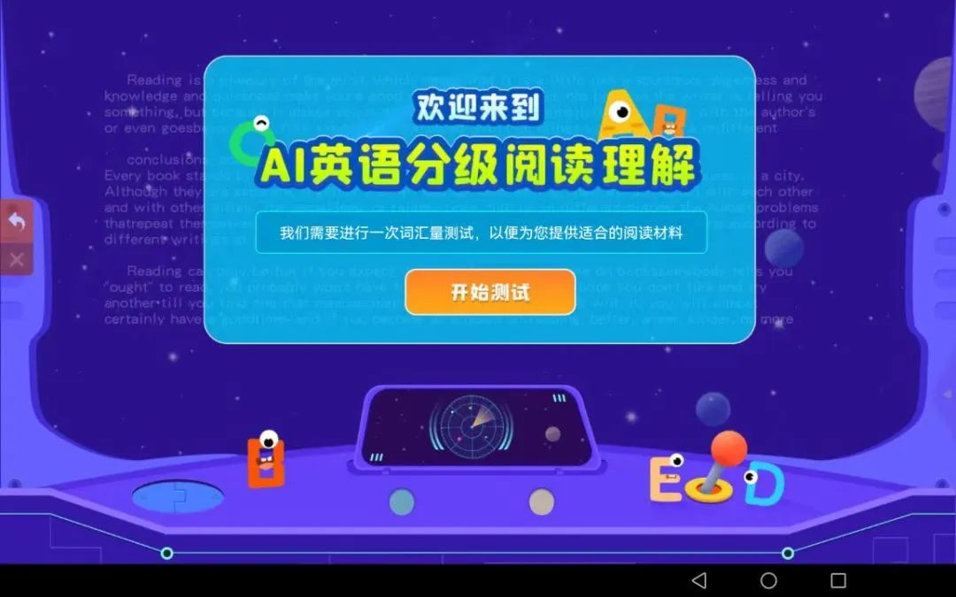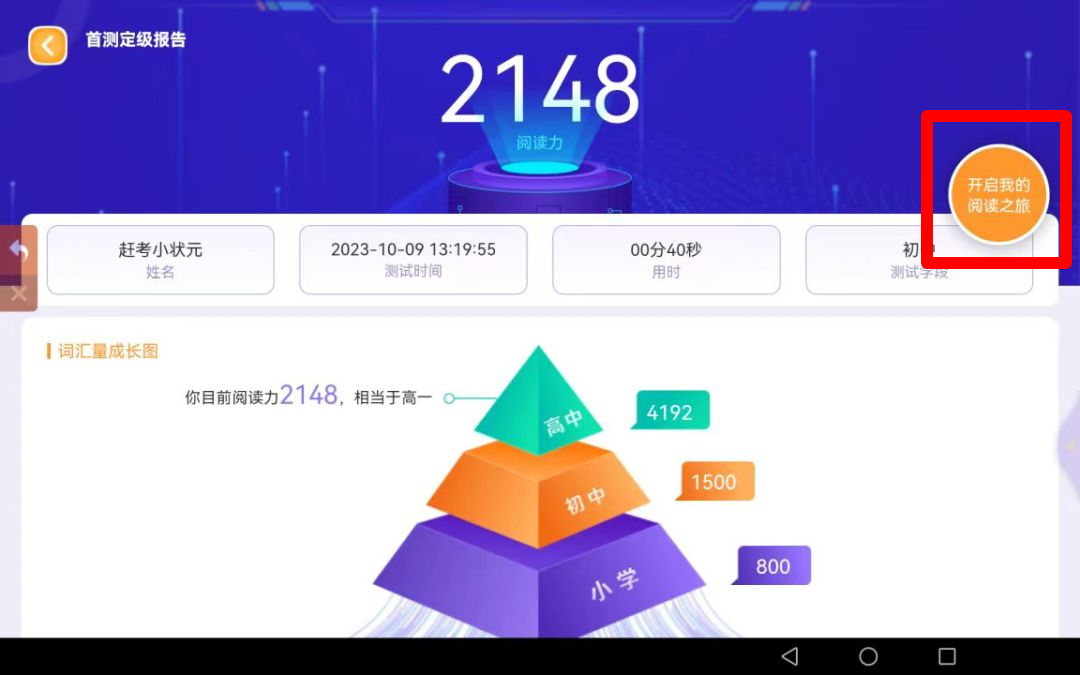 在【智能工具】页面中进入【AI英语分级阅读理解】,初次使用时,系统需要检测学生的初始阅读能力水平,即【首测定级测】,首测定级报告会呈现学生当前的阅读力指数,然后点击【开启我的阅读之旅】就可以进入到正式的阅读训练。