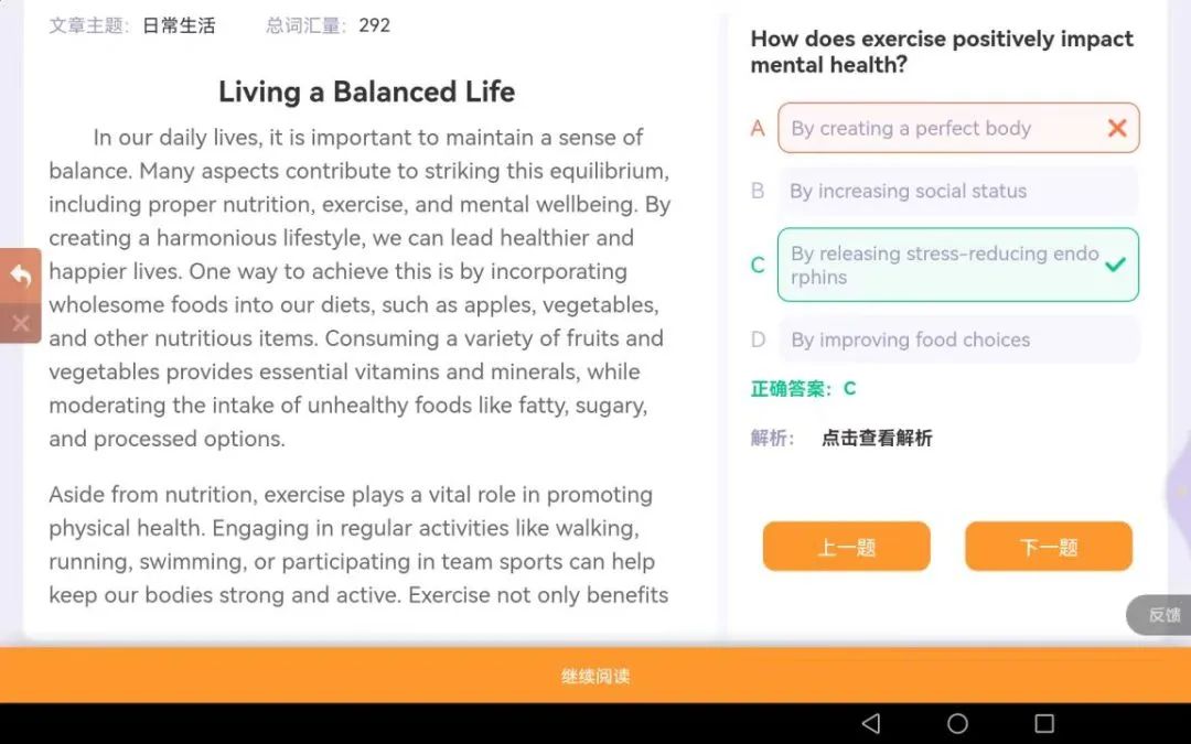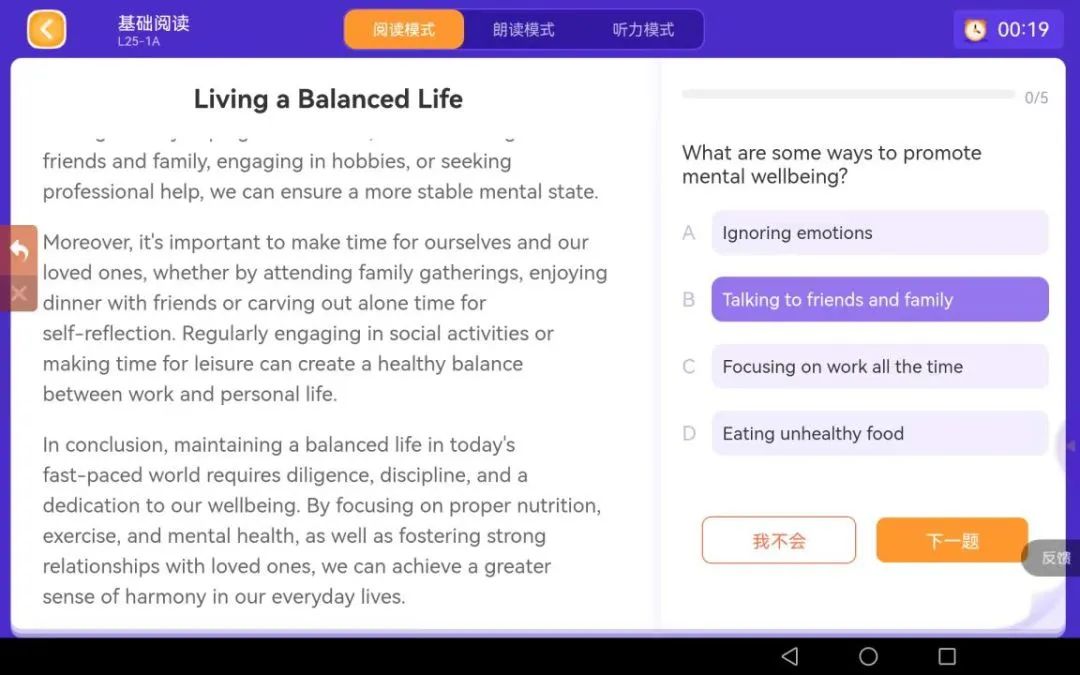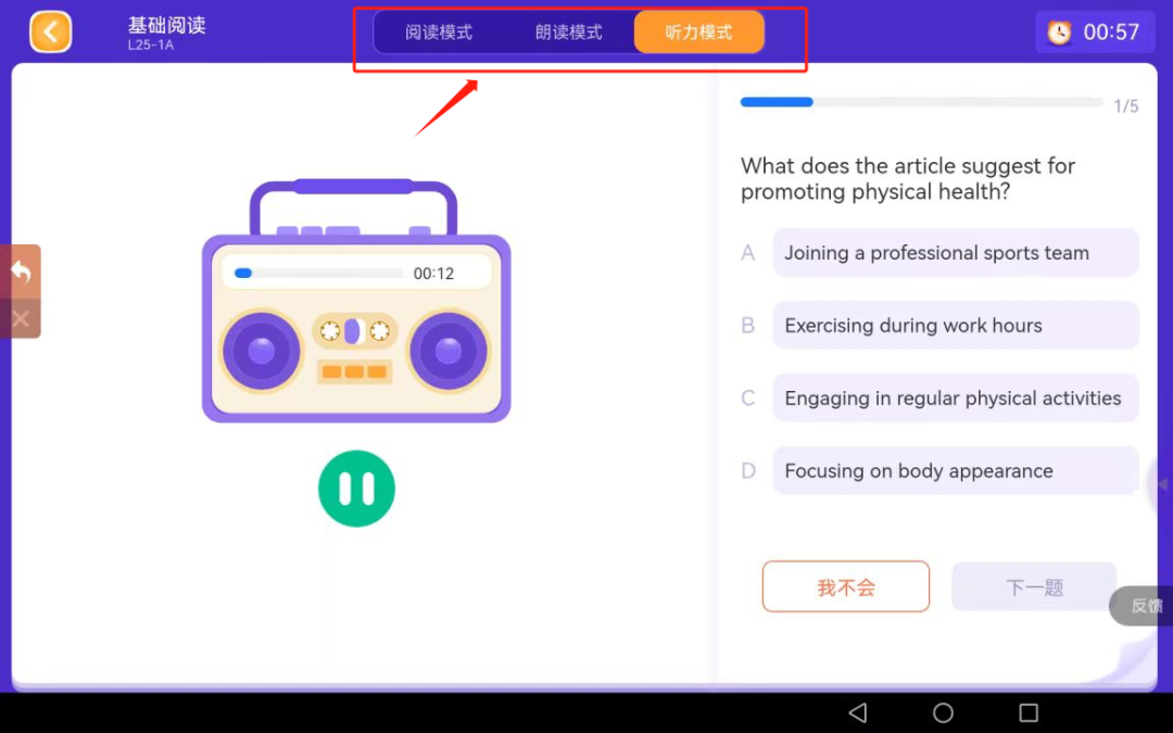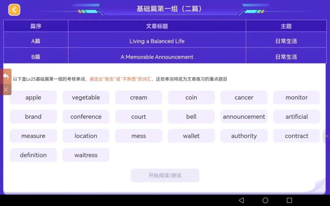 接下来就可以开始正式挑战了!共分为基础阅读阶段和个性化精准阅读,不同体裁和类型的阅读理解题目,紧贴考试大纲,并且支持阅读、朗读和听力模式,全方位提升英语听说读写水平!
