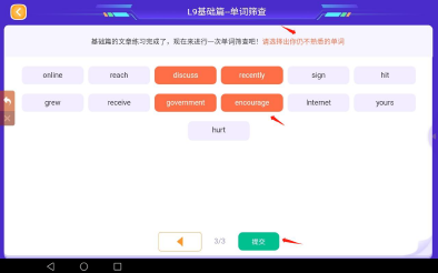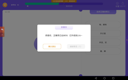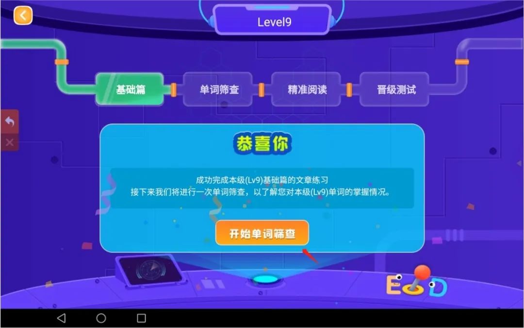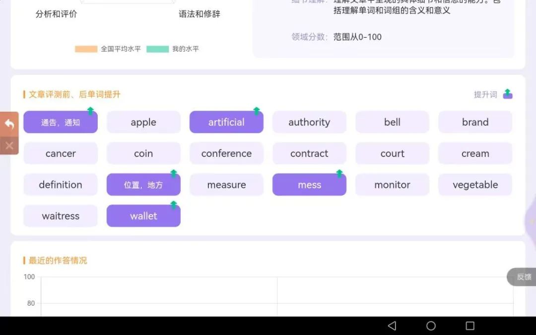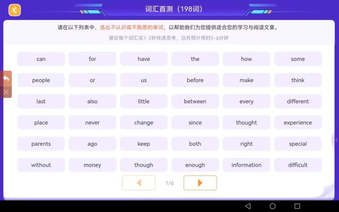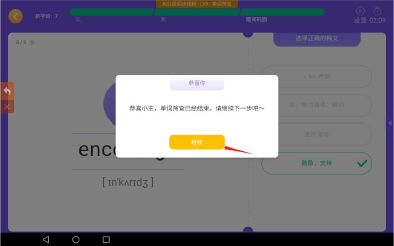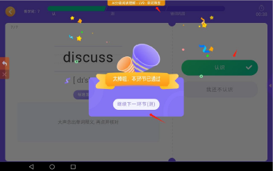 个性化阅读后,进入最后的词汇晋级测评,测评过程中达到 80%正确率即可达成升级。