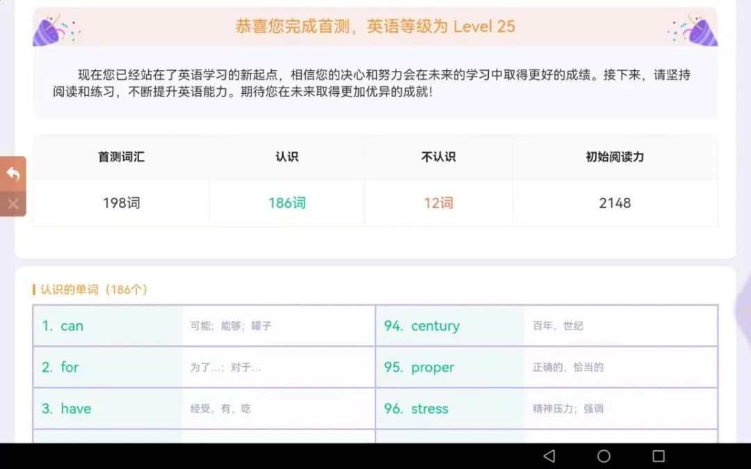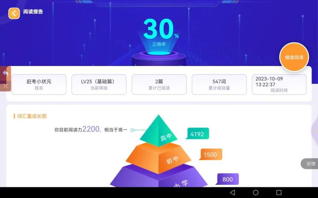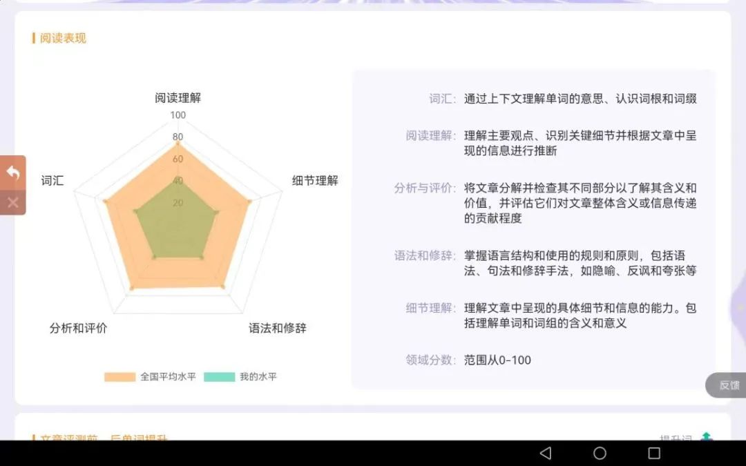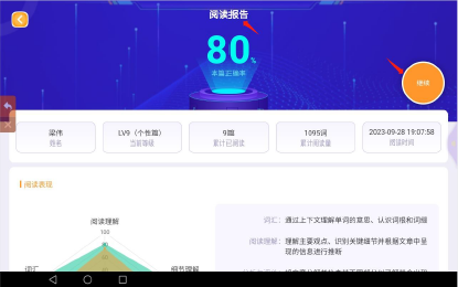 做完题目以后智能生成阅读报告,不仅能查看文章习题的解答详情与解析,更能找到自己阅读的薄弱项和生字词。在完成多组阅读文章后,会再次对当前级别词汇进行单词筛查,筛查出的未掌握单词,可以快速巩固背诵学习,巩固背诵完成后,即将进入个性化阅读阶段。