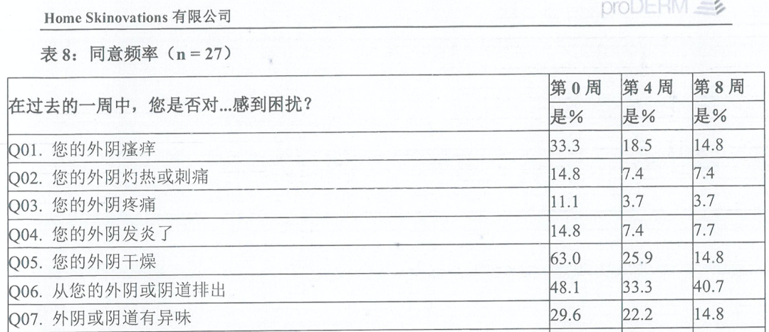 干预后的结果还是很有说服力。包括阴道瘙痒,干燥等症状在4-8周的干预后都有明显改善,阴道异味情况也在第8周↓了一半。