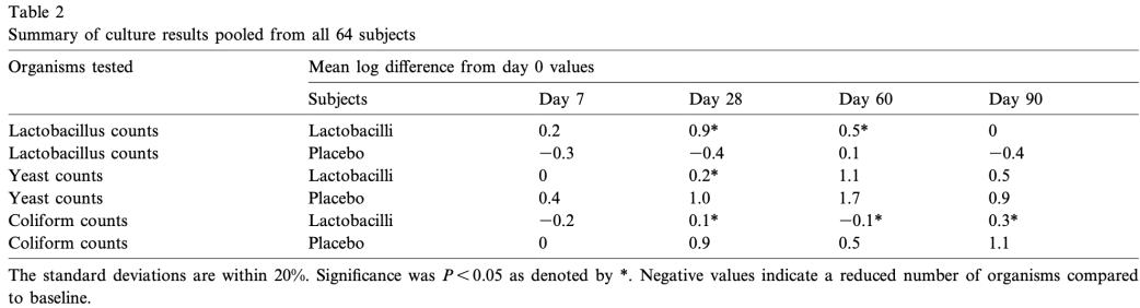 菌群培养结果也证实,接受乳酸杆菌治疗的受试者在第 28 天和第 60 天阴道乳酸杆菌都有显著增加,同时可能有害的肠杆菌数量显著降低【4】。