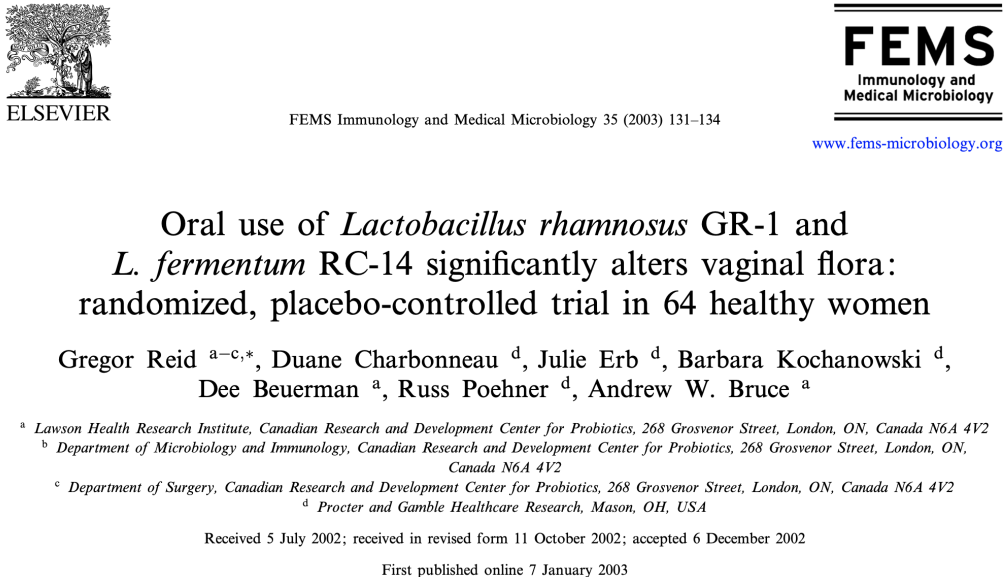 最早的研究文献要回到接近20年前。2003年,加拿大一项持续60天的研究在64名健康女性志愿者中进行。实验组人员需要每天口服鼠李糖乳杆菌GR-1和发酵乳杆菌RC-14混合胶囊,并在0,7,28,60天等时间点接受随机和对照试验【4】。