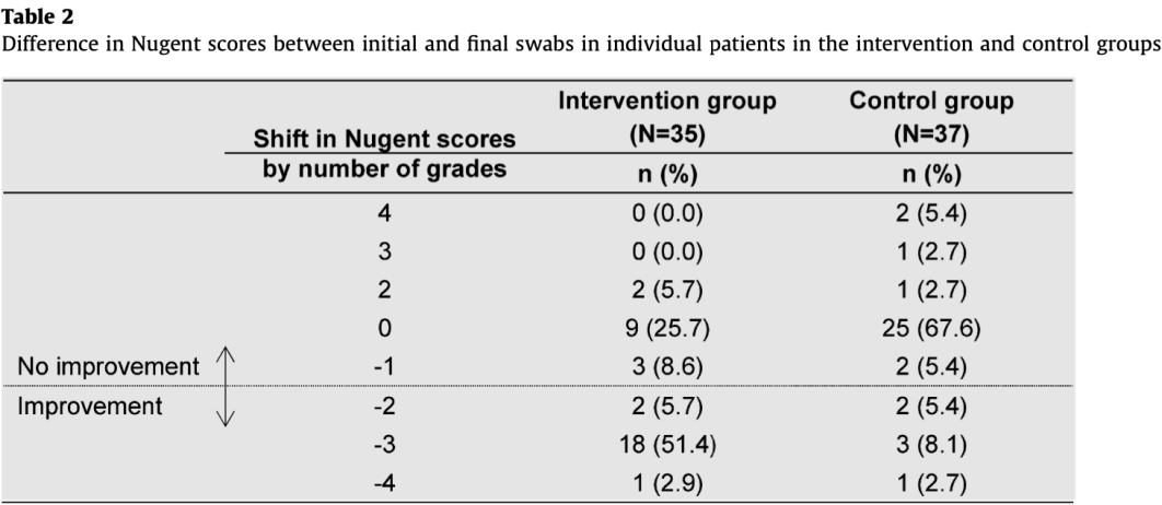 口服干预14天后的测试结果表明,实验组中有超过一半的受试女性(18名/35名)有非常显著的测试指标改善(Nugent得分),与对照组的结果形成了鲜明对比【5】。