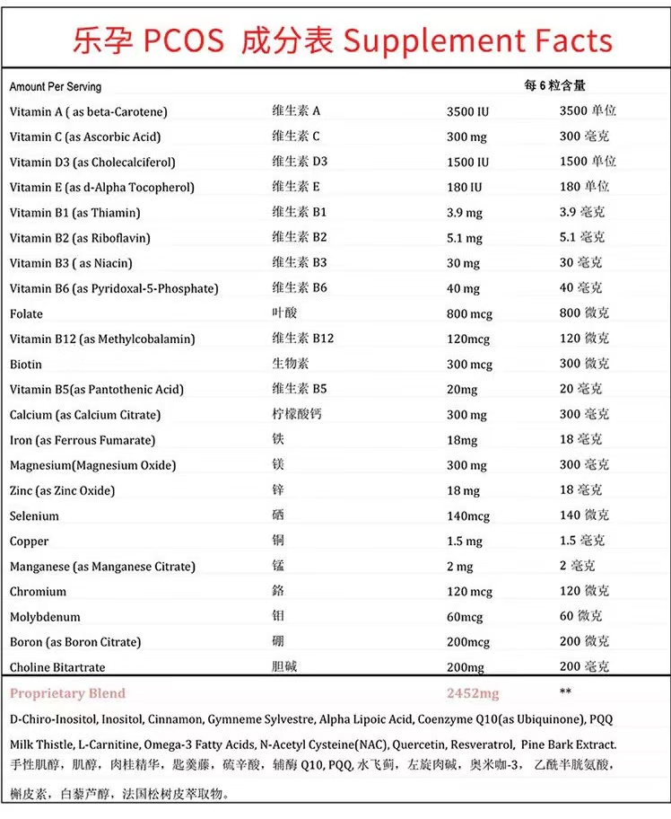 基础的维生素——活性叶酸,VE,B12&镁&D3(多囊易缺乏),VE&B6…,生物素…等等!专利配方:以上所提到的都有。