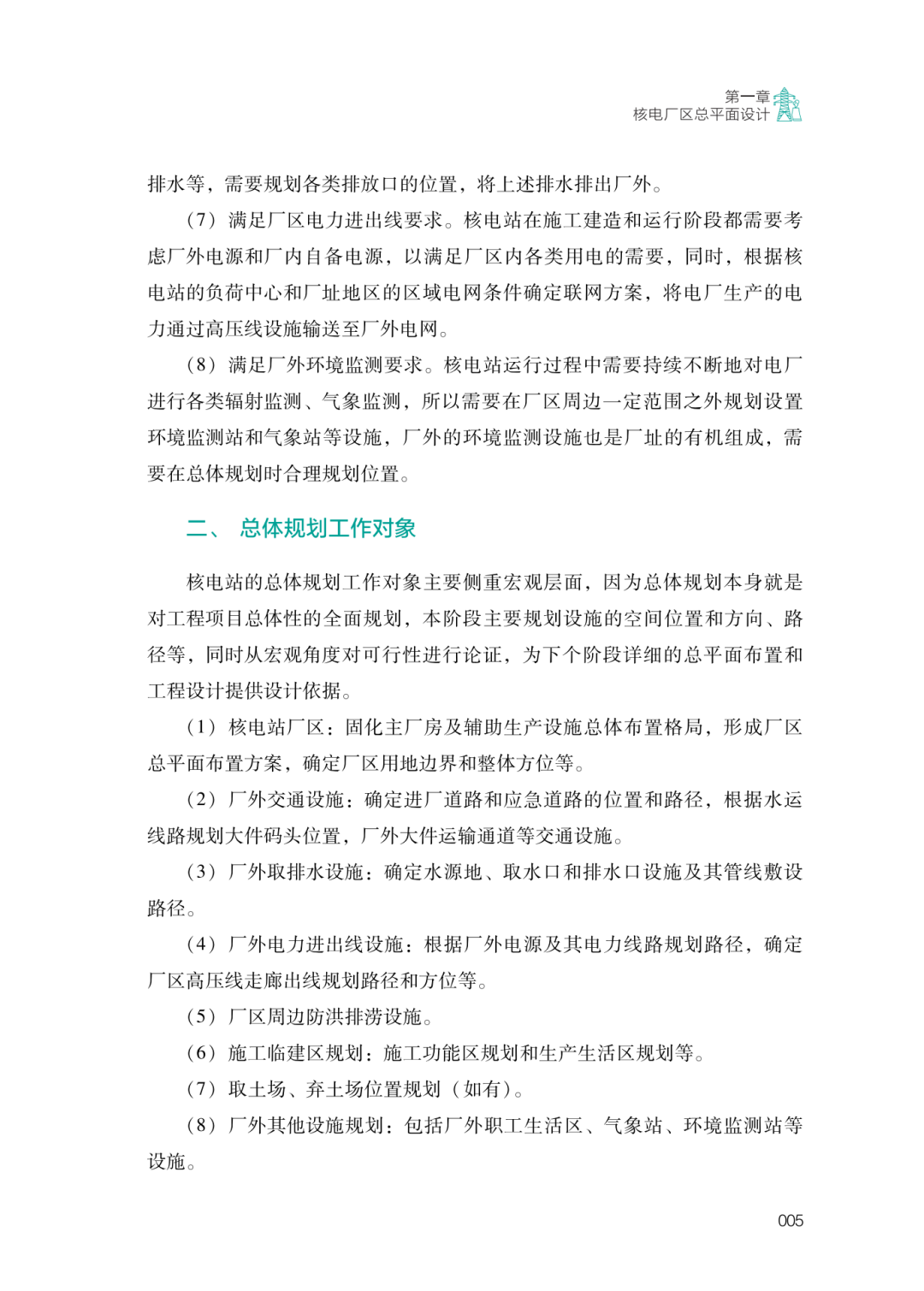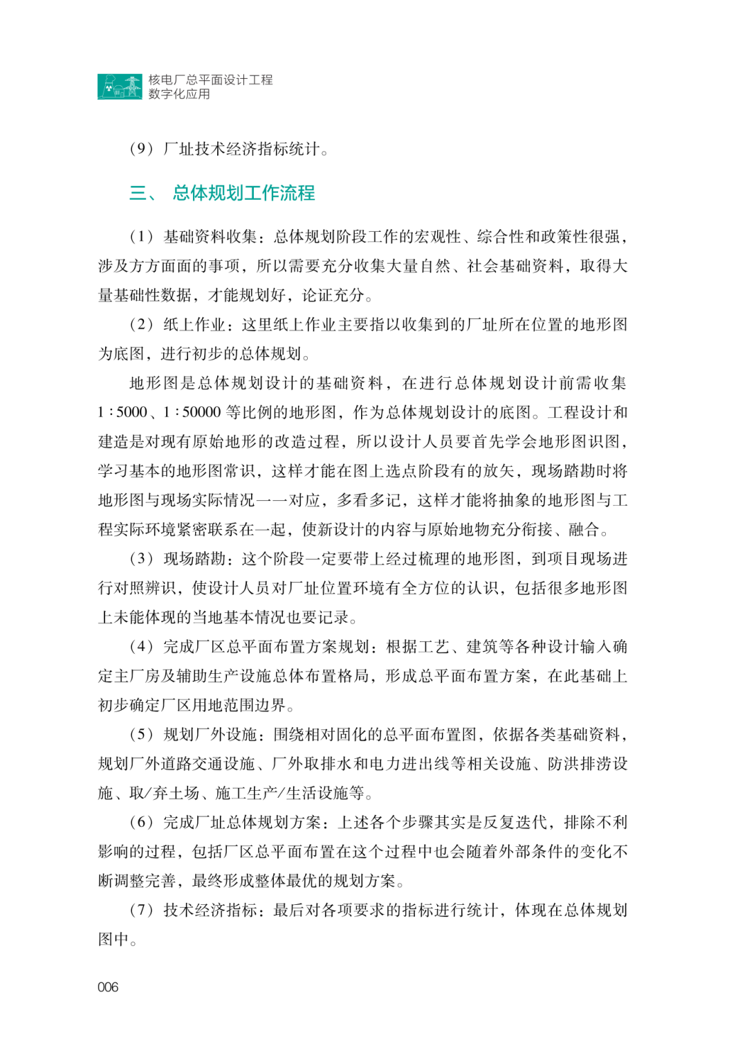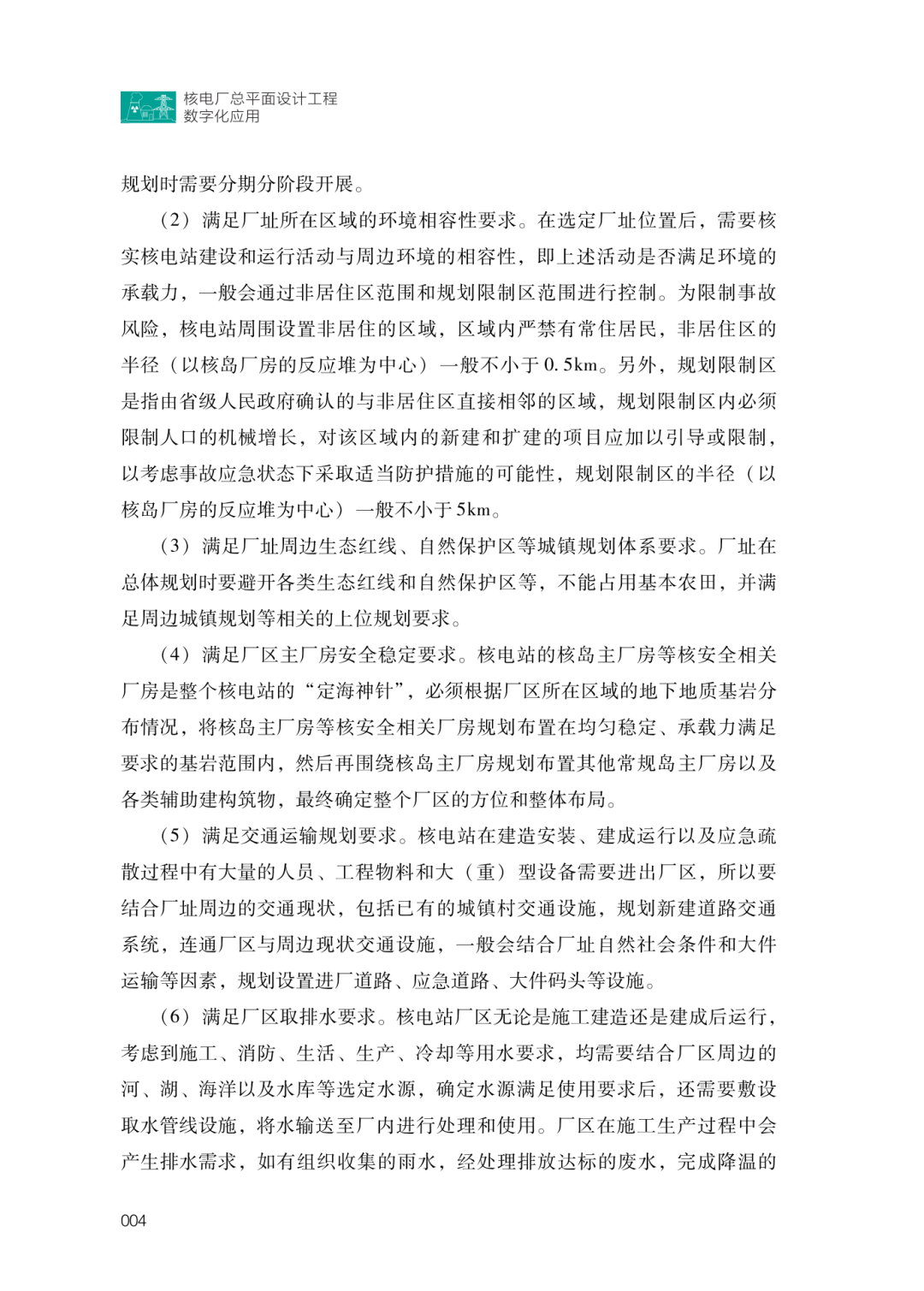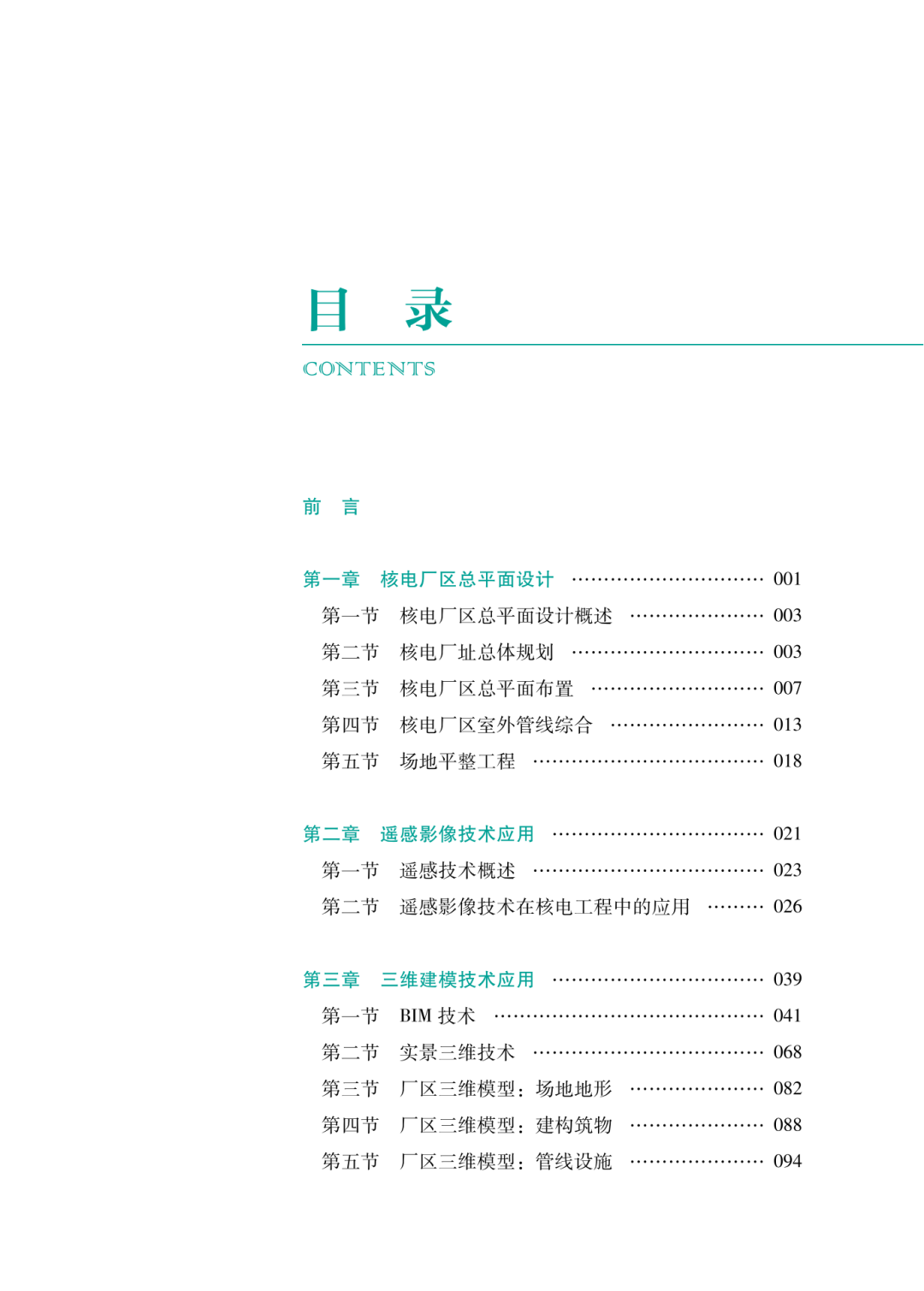 本书系统介绍了核电站工程总平面设计数字化技术应用的实践和思考,其中数字化技术涉及领域广泛, 包括测绘、计算机、城市规划等行业领域的卫星遥感(RS)技术、建筑信息模型(BIM)技术、实景三维 技术、数据库技术、地理信息系统(GIS)技术等,内容涵盖数字化技术相关的基本概念和知识,数字化 技术应用案例等,并分析应用现状及发展方向,介绍常见相关软件平台的基本操作知识、发展历史以及应 用开发过程等内容,突出实用性,每章均介绍实际应用案例及其心得。本书包括六章,主要内容包括核电 厂区总平面设计、遥感影像技术应用、三维建模技术应用、工程数据相关应用、地理信息系统应用、厂区 工程数字化项目实践等。