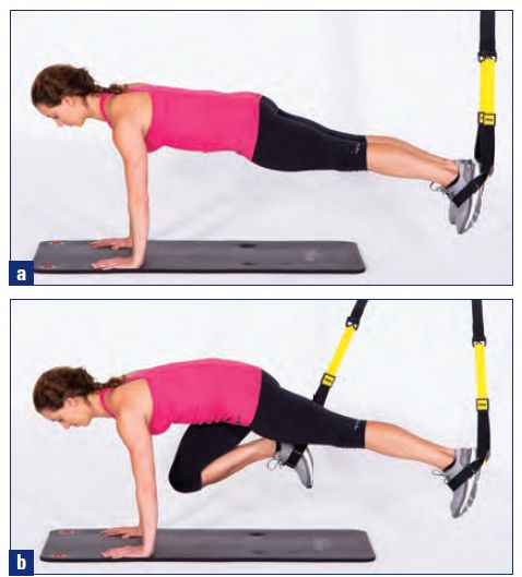 1、右膝拉向胸部,然后恢复至起始姿势。