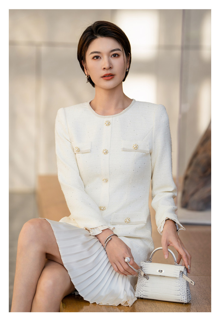 今天推荐的这款法式小香风连衣裙,以温柔米白为底色。圆领搭配精致金属扣,简约中尽显优雅。两侧口袋设计增添复古感,长袖贴合身形