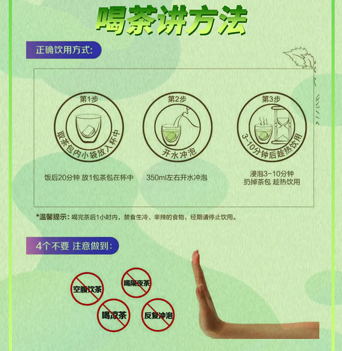 建议大家餐后冲泡,而且每袋茶包仅需冲泡一次,无需反复冲泡,然后趁热饮用后即可,按照这个方式服用之后效果会更好哦~